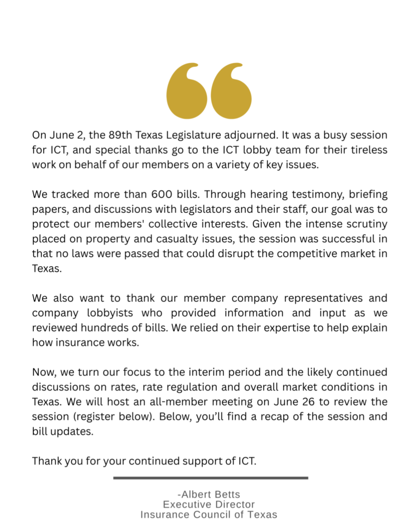 For more Texas-related P&C insurance information and news, visit the ICT website